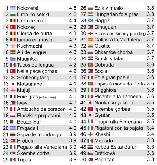 Otantik ve yöresel lezzetleri ülkeler arasında sıralamasıyla sık sık gündeme gelen dünyaca ünlü yemek eleştiri firması, son olarak dünya ülkelerinin sakatat yemeklerini puanladı. İçerisinde Türkiye ve Yunanistan'ın da olduğu listede Yunanistan 4.6 puan alan ‘kokoretsi' ile birinciliği alan ülke oldu. Türkiye ise aynı listede kokoreç ile 4, kelle paça çorbası ile 11, işkembe çorbası ile 42'nci sırada yer aldı. Yunanistan medyasında bunun ‘Geleneksel Yunan lezzeti dünyada birinci oldu' başlıklı haberle verilmesi ise Türkiye'de tartışmalara neden oldu. Yunanistan medyası daha önce de Türk mutfağına ait olan Türk kahvesi, baklava ve cacık gibi birçok yemeğin kendi kültürlerine ait olduğunu iddia etmişti.