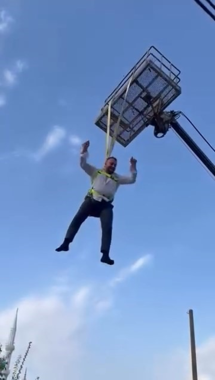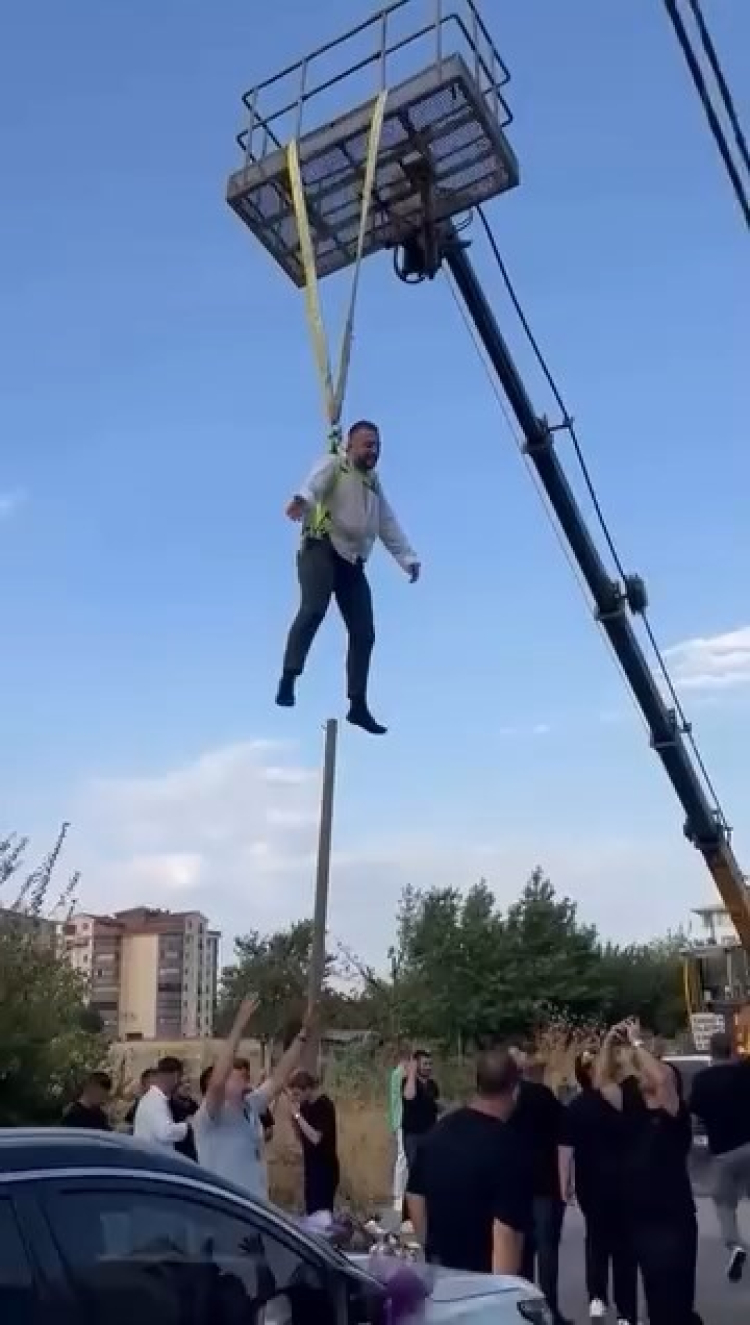 Bursa'da düğün öncesi damada görülmemiş işkence kayda alındı. Vinç ile havaya kaldırdıkları damadın altında arkadaşları göbek attı.