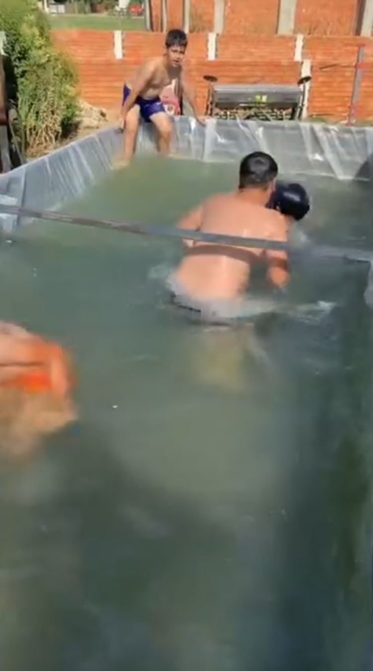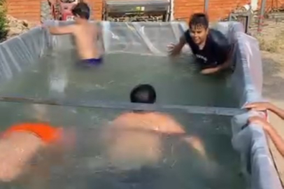 Bursa'nın Yenişehir ilçesinde sahibi olduğu kamyonun kasasını naylon ile kaplayıp içerisine su dolduran bir vatandaş kamyonu çocuklar için yüzme havuzu haline getirdi.