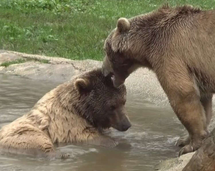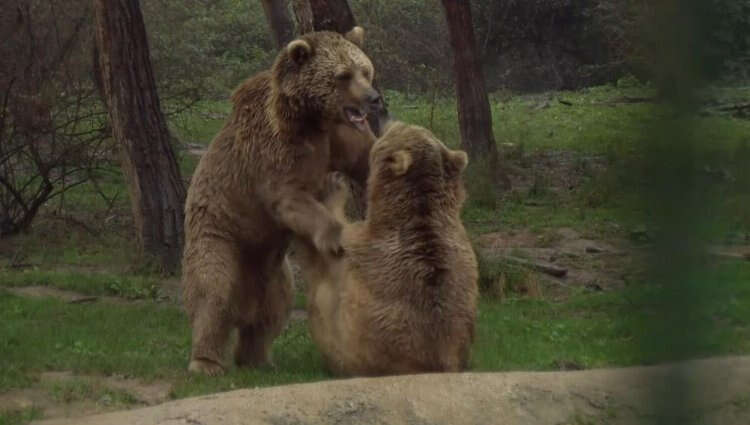 Dünya Uyku Günü'nde kış uykusundan uyanan ayılar önce güreşip ardından banyo keyfi yapıyor.