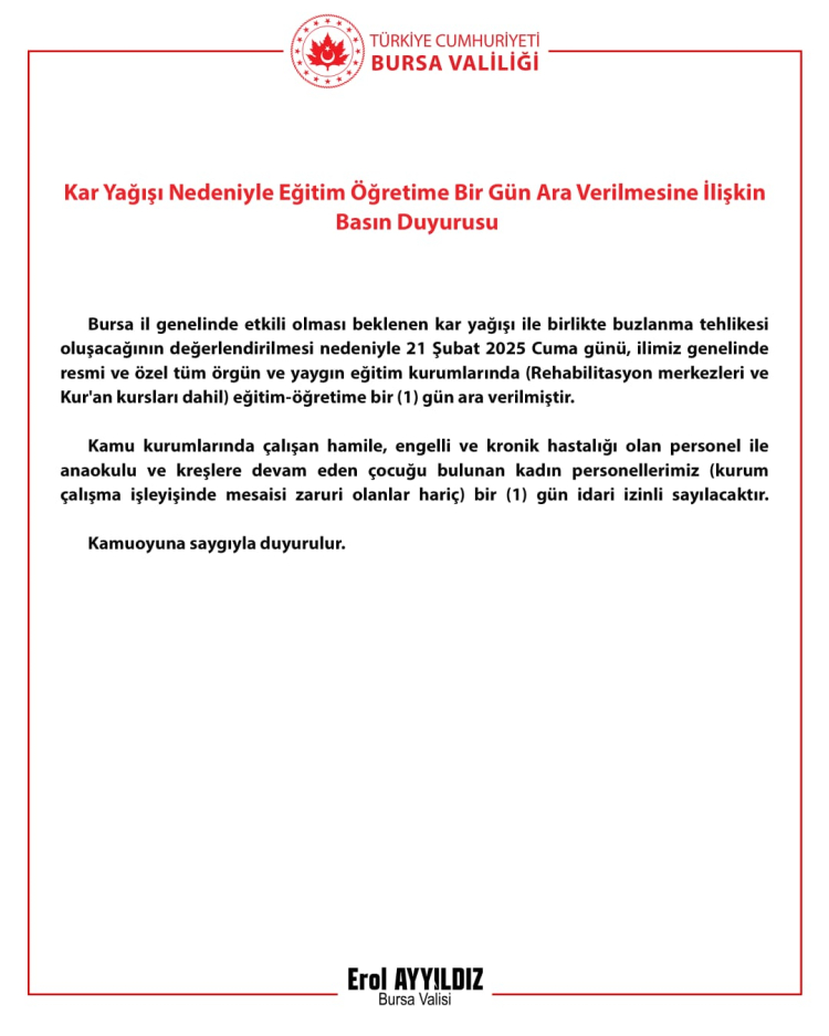 "Bursa il genelinde etkili olması beklenen kar yağışı ile birlikte buzlanma tehlikesi oluşacağının değerlendirilmesi nedeniyle 21 Şubat 2025 Cuma günü, ilimiz genelinde resmi ve özel tüm örgün ve yaygın eğitim kurumlarında (Rehabilitasyon merkezleri ve Kur'an kursları dahil) eğitim-öğretime bir (1) gün ara verilmiştir.