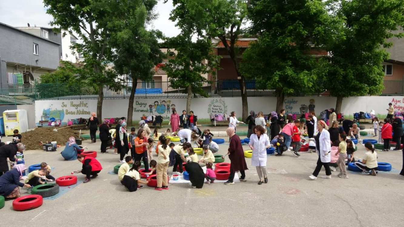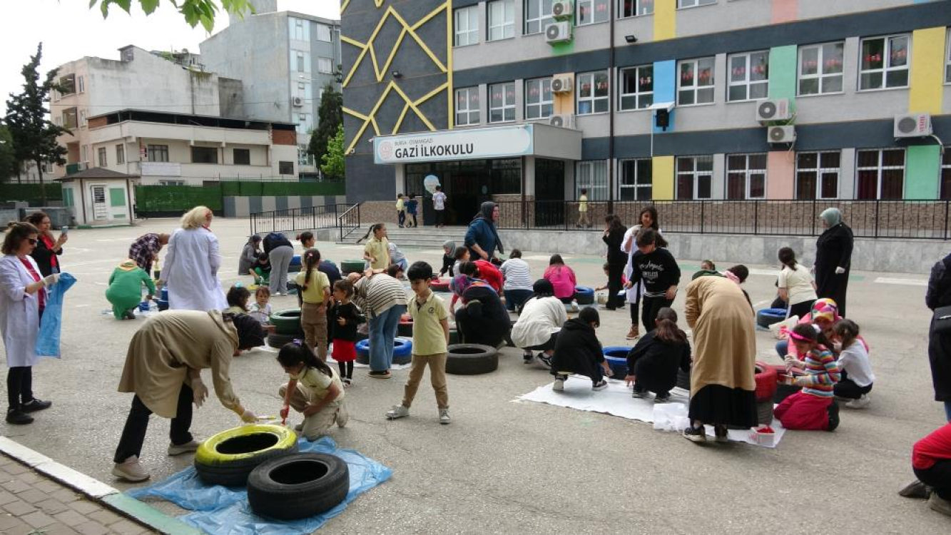 Bursa’da kadın istihdamının arttırılması ve çevre bilinci oluşturmak adına Gazi İlkokulu’nda çevreci bir etkinlik gerçekleştirildi. Öğrenciler, veliler ve öğretmenlerin katıldığı etkinlikte eski lastikler boyanarak geri kazandırıldı. Öğretmenlerin koordinesinde öğrenciler ve anneleri tarafından boyanan lastiklerin içine toprak doldurularak çiçekler ekildi. Yaklaşık 100 öğrenci ve velinin katıldığı etkinlik toplu fotoğraf çekimi sonrası sona erdi.