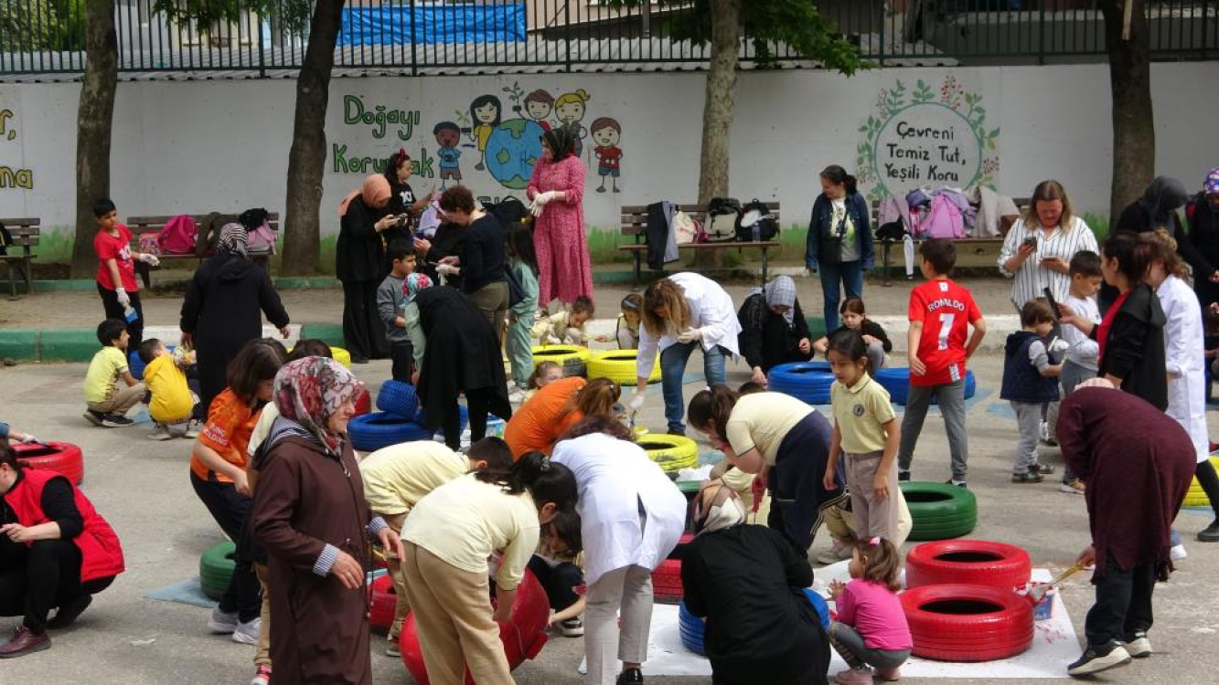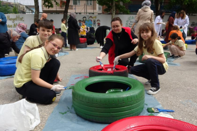 Bursa’da Gazi İlkokulu’nda yapılan etkinlikle yaklaşık 100 veli ve öğrenci eski lastikleri boyayarak saksı yaptı. Renkli lastiklerle birlikte okula yeşil alan kazandırılırken veliler de çocukları ile birlikte keyifli vakit geçirdi. Saksı lastiklere çiçeklerin yanı sıra maydanoz, domates ve çeşitli bitkiler dikildi.