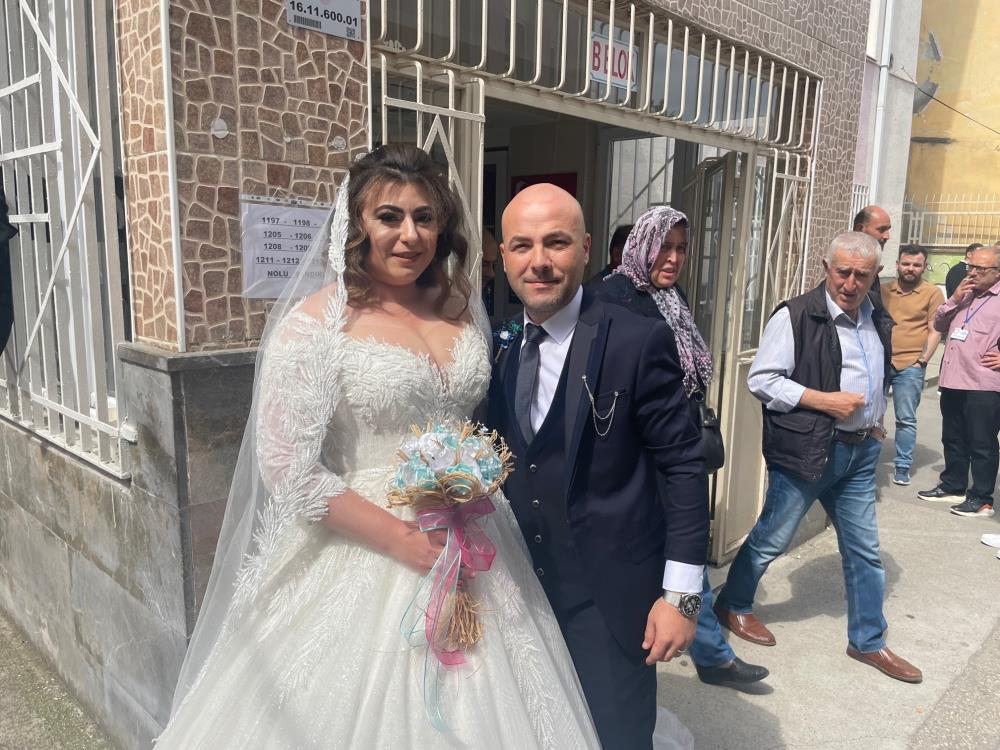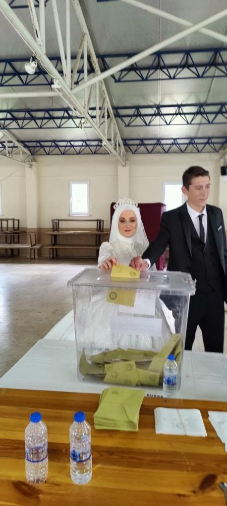 Öte yandan Yenişehir ilçesi Çiçeközü köyünde de gelen Sedef Türkyılmaz, müstakbel eşi Ahmet Buran ile birlikte gelinlikle sandık başına gitti.