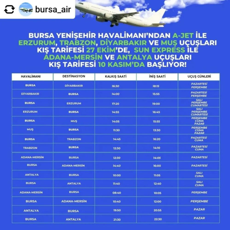 Sosyal medyada hesabından açıklamada bulunan 27. Dönem AK Parti Bursa Milletvekili Mustafa Esgin, Bursa Havalimanı'nda kış tarifesinin 27 Ekim'de başlayacağını söyledi. Esgin, "Bursa Havalimanımızda Kış Tarifesi Uygulaması 27 Ekim’den itibaren başlıyor. Yeni dönemde Bursa’dan 6 havalimanı ve 7 ilimize karşılıklı direkt uçuşlar başlamış olacak. Bursa’mıza ve Bursa Havalimanımıza inanıyoruz" dedi.