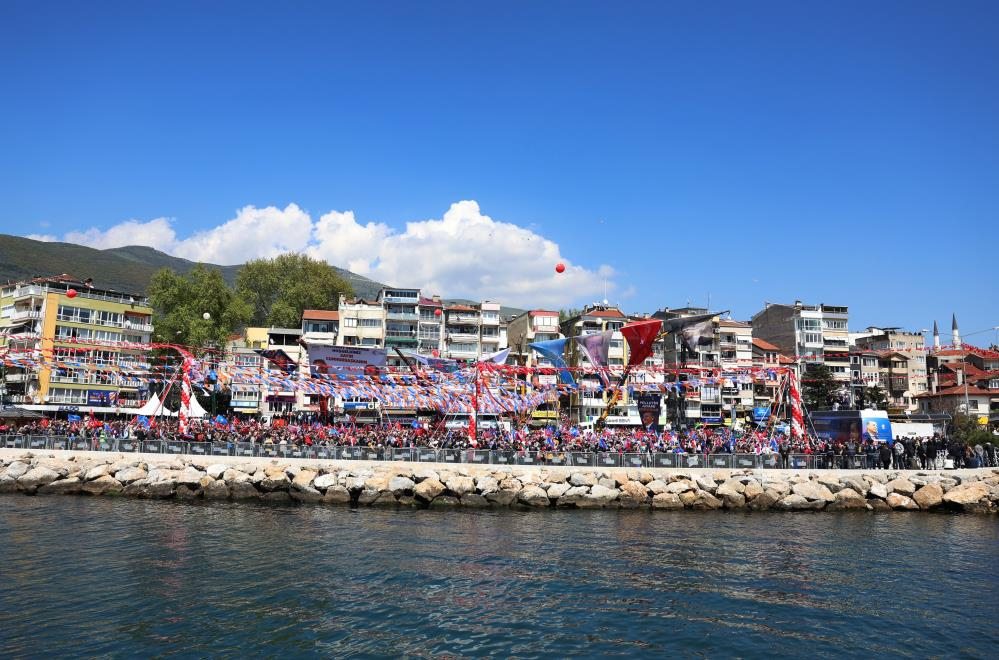 PKK ve FETÖ terör örgütlerinin mensupları şimdi gün sayıyormuş. 14 Mayıs'ta bütün heveslerini kursaklarında bırakacaksınız. Askeri faaliyetlerimizden rahatsız olanlar da gün sayıyor. Aralarındaki kavga, dövüş şantaj oyunları ayyuka çıkanların ülkeye bir taahhüdünü duydunuz mu, eğitimde, sağlıkta güvenlikte, ulaşımda, tarımda herhangi bir proje vadettiklerini duydunuz mu, evlatlarımızın geleceğine dair herhangi bir şeylerini duydunuz mu duyamazsınız. Bunların böyle bir derdi yok. Güvenliğimizi terör örgütlerine, ekonomimizi tefecilere teslim ederek Türkiye'yi yarım asır geriye götürmektir. Ülkemizi bu yıkım ekibinin insafına terketmeyeceğiz. Burası Bursa'nın en önemli ilçesi Gemlik. Eskiden İstanbul- İzmir arası ne kadardı. 7.5 saat. Şimdi 3 saat 15 dakika. İndirdik mi. Sen İzmir milletvekilisin. Bir çok belediye size ait ne yaptın İzmir'e. İstanbul -İzmir arasını 3.5 saate indiren Ak Parti'dir. Biz yaparız siz yıkarsınız. Osmangazi köprüsünü yaptık mı, kullanıyor musunuz. Marmara'yı yaptık, kullanıyor musunuz, Avrasya'yı yaptık, kullanıyor musunuz. Biz size aşığız aşık. Bundan sonra da yapmaya devam edeceğiz. Gemlik'ten öyle bir ses verin ki Marmara'nın dört bir yanından duyulsun" dedi.