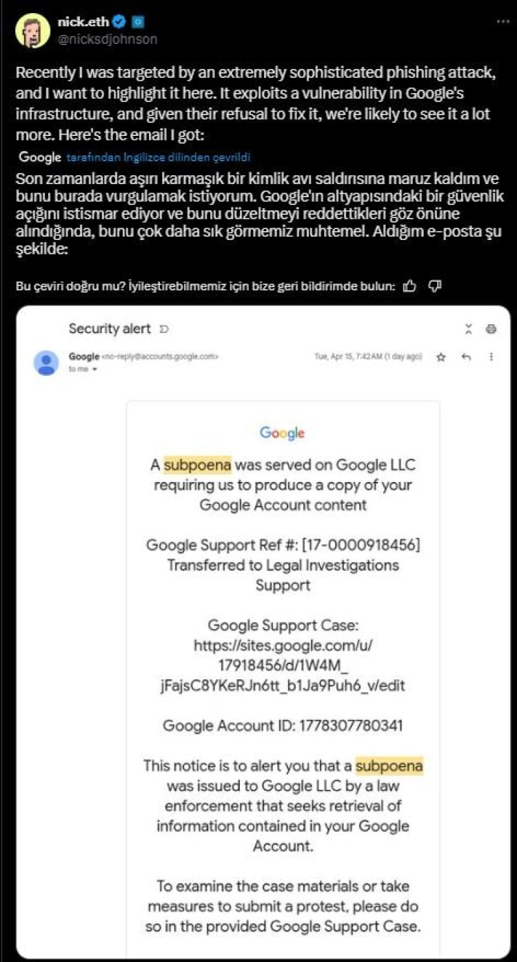 Mesajda yer alan bir bağlantı, kullanıcıyı sözde resmi bir Google destek sayfasına yönlendiriyor. Ancak Google, bu e-postaların tamamen sahte olduğunu ve dolandırıcıların kişisel verilere ulaşmak için bu yöntemi kullandığını açıkladı.