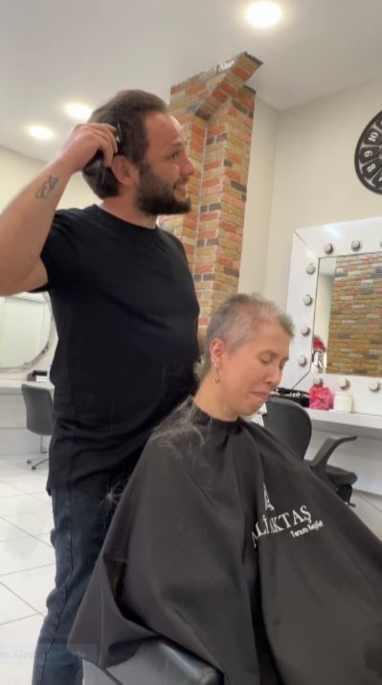 Kendi saçını da keserek arkadaşına destek olmak istediğini söyleyen Aktaş, “Biz normalde sosyal medya çekimleri yapıyoruz kuaförümüzde. Biz kendisine öncesi sonrası şeklinde hatıra kalması amacıyla bir video çekmek istedik. Sosyal medya ekibimizle konuştuk bu fikre kendisi de olur dedi. Saçını kesmeye başladığım anda duygusal bir an oluştu. İlk üzgün hali doğal olarak beni çok etkilemişti çünkü kendisi sevdiğim bir insan. O yaptığım saçları kesmek beni derinden etkiledi, ben de saçlarımı uzun zamandır uzatıyordum. Onun için değer diye düşündüm ve ona moral olsun, bu yolda yalnız değilsin demek için ben de başladım makineyle saçımı kazımaya. Saçımı kazıdığımda duygusal bir an oluştu kendisi de beklemiyordu. Kendisi 'yapma' dedi ama ben 'hayır yapacağım bu yolda beraberiz' dedim ve inatla kazımaya devam ettim. Sonrasında da çok duygusal anlar oldu sarıldık, ağladık. Sonrasında berbere gidip iyice temizlettim saçımı. Kendisini ağlayarak mecbur gönderdik” şeklinde konuştu.
