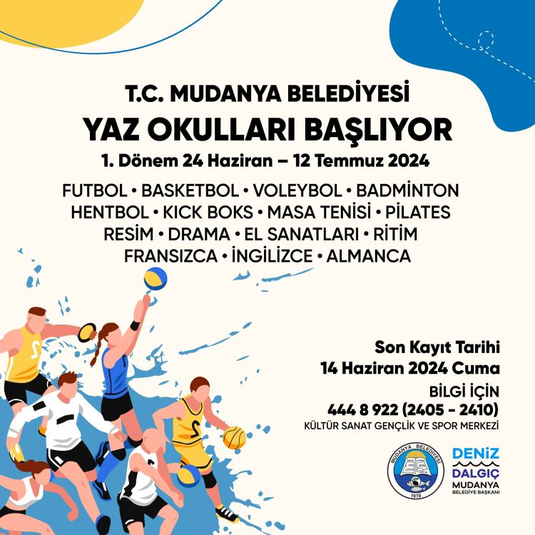 Yaz okulları ile ilgili kayıt işlemleri Yeni Mahalle Kültür, Sanat, Gençlik ve Spor Merkezi’nde yapılacak. Detaylı bilgi 444 8 922 dahili 2405-2410 numaralar ile www.mudanya.bel.tr adresinden alınabilecek.