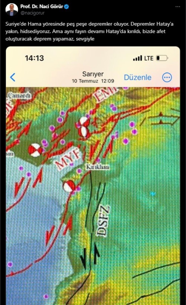 Deprem uzmanı Naci Görür, Hatay’da afet oluşturacak bir deprem beklenmediğini belirterek, “Suriye’de Hama yöresinde peş peşe depremler oluyor. Depremler Hatay’a yakın, hissediyoruz. Ama aynı fayın devamı Hatay’da kırıldı, bizde afet oluşturacak deprem yapamaz, sevgiyle” ifadelerini kullandı.