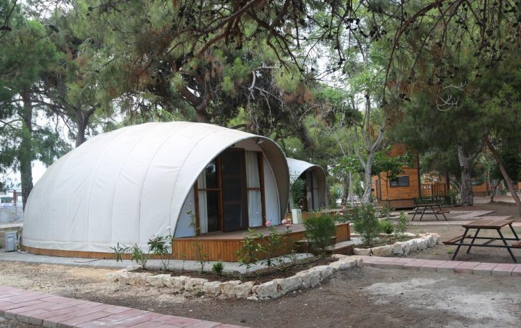 Mersin Erdemli'de deniz, kum, güneşle birlikte mavi ile yeşilin buluştuğu yer olan Talat Göktepe Tabiat Parkı'na yapılan bungalov evler ile glamping çadırlarda 5 yıldızlı tatil keyfi ortamı oluşturuldu.