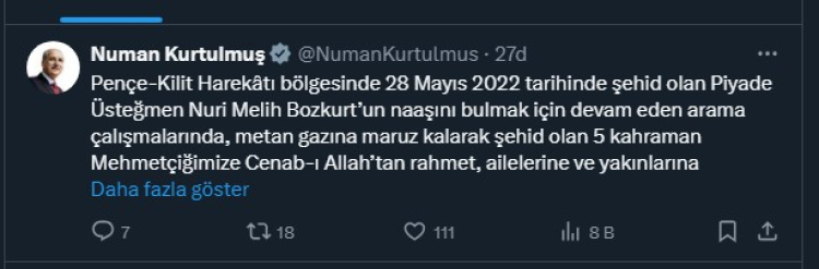 TBMM Başkanı Numan Kurtulmuş, sosyal medya hesabından yaptığı paylaşımda, "Pençe-Kilit Harekatı bölgesinde 28 Mayıs 2022 tarihinde şehit olan Piyade Üsteğmen Nuri Melih Bozkurt'un naaşını bulmak için devam eden arama çalışmalarında, metan gazına maruz kalarak şehit olan 5 kahraman Mehmetçiğimize Cenab-ı Allah'tan rahmet, ailelerine ve yakınlarına sabırlar; tedavisi sürenlere acil şifalar diliyorum. Milletimizin başı sağ olsun" ifadelerini kullandı.