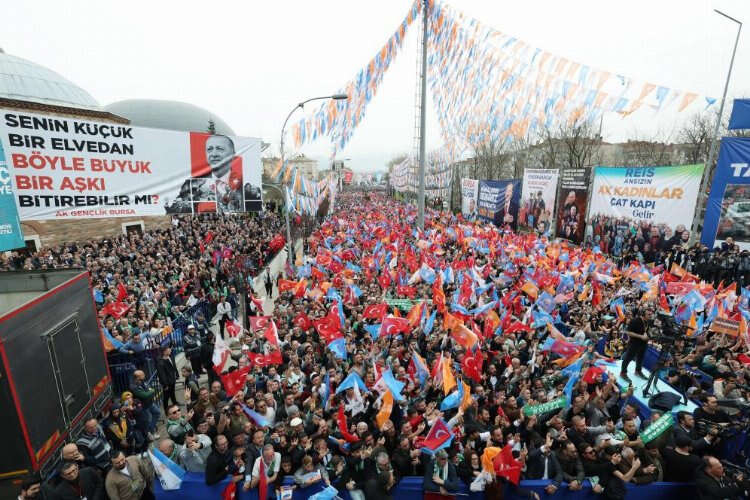 Muhalefet belediyelerini eleştiren Erdoğan, “Belediyelerde yaptıklarını görüyorsunuz. 5 yıldır iflas etmedikleri yer kalmadı. Sorunsuz ilerleyen sistemi bile devam ettiremediler. Yalanları ile sizleri kandırmanın peşindeler. Tüm samimiyet ve içtenlikle tüm hak ve hakkaniyetle size gerçeği söylüyor çözüm yolumuzu paylaşıyoruz. 21 yılda nasıl 3 kat Türkiye’yi büyüttüysek önümüzdeki dönemde 2 kat daha büyütüp sözlerimizi fazlasıyla tutacağız. Yeter ki birliğimize beraberliğimize sahip çıkarak ülkemizin bütünlüğünde devletimizin bekasında gözü olanları sevindirmeyelim. Gerisi sadece gayret vakit ve planlama meselesidir” ifadelerini kullandı. Bursa'ya 21 yılda 327 milyar liralık yatırım