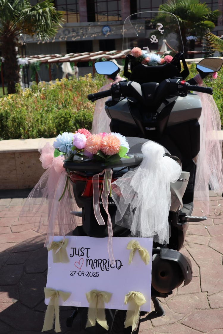 Nikahın ardından motosikletlerini çiçek ve tüllerle süsleyen çift, düğün konvoyuna ilginç bir renk kattı. Gelinlik yerine beyaz takım tercih eden Şule Albayrak Çağın ve damat Emre Çağın, süslenmiş motosikletleriyle şehir turuna çıktı. Renkli görüntülere sahne olan anlarda çevredeki vatandaşlar çifti alkışlayarak mutluluklarına ortak oldu. O anları görenler de çiçeği burnunda çifti görüntülemeyi ihmal etmedi.