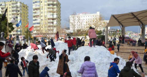 Adana’nın Kozan ilçesinde kamyonlarla parka kar getirildi. İlk kez kar gören çocuklar büyük sevinç yaşadı.