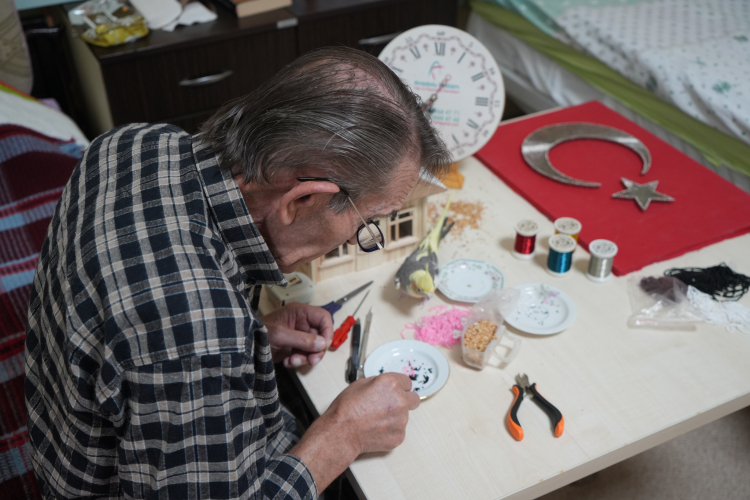Bayburt Memnune Evsen Huzurevi Yaşlı Bakım ve Rehabilitasyon Merkezi sakinlerinden 74 yaşındaki Bülent Alemdar, pandemi döneminde tanıştığı el sanatlarıyla takı tasarımı, filografi ve maket alanında çalışmalar yapıyor. El emeği ürünler hazırlayan Alemdar, 6 yıldır üretmeyi sürdürüyor.