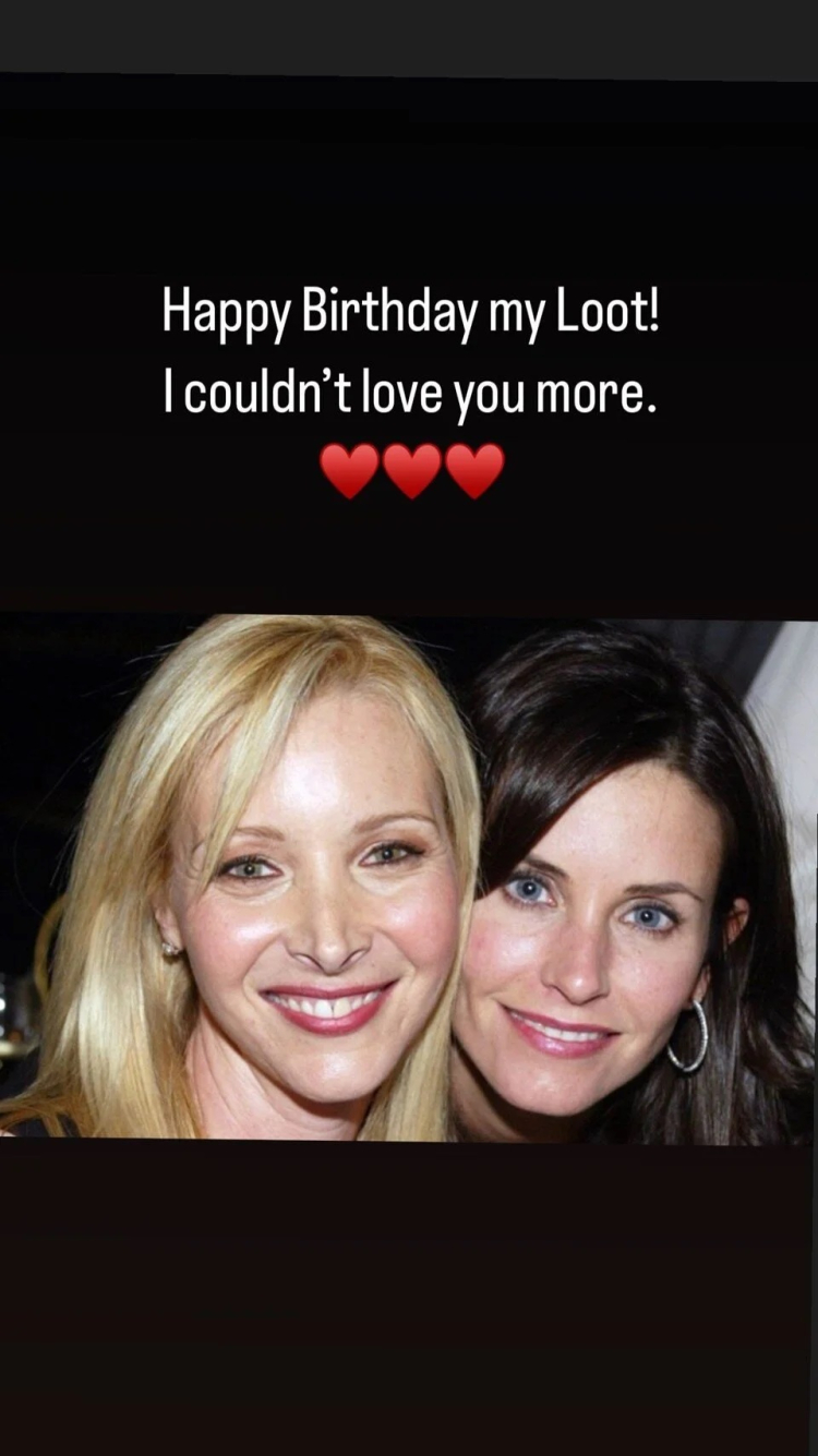 Courteney Cox da yakın dostuna "Doğum günün kutlu olsun Loot'um! Seni bundan daha fazla sevemezdim" diye seslendi. Lisa Kudrow, Jennifer Aniston, Courteney Cox, Matthew Perry, David Schwimmer ve Matt LeBlanc'ın başrolleri paylaştığı ve 1994-2004 yılları arasında ekrana gelen "Friends", dünya çapında çok büyük bir hayran kitlesine sahip.