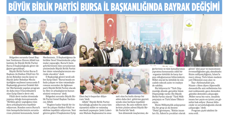 Büyük Birlik Partisi Bursa İl Başkanı Av.Haldun Filizli’nin Yıldırım Belediye meclis üyesi ve Büyük Şehir Belediye Meclis üyeliğine seçilmesi sonucunda İl Başkanlığı görevini Ördekli Kültür Merkezinde yapılan program ile daha önce İl koordinatörü olan Eyüp Eken’e devir etti.