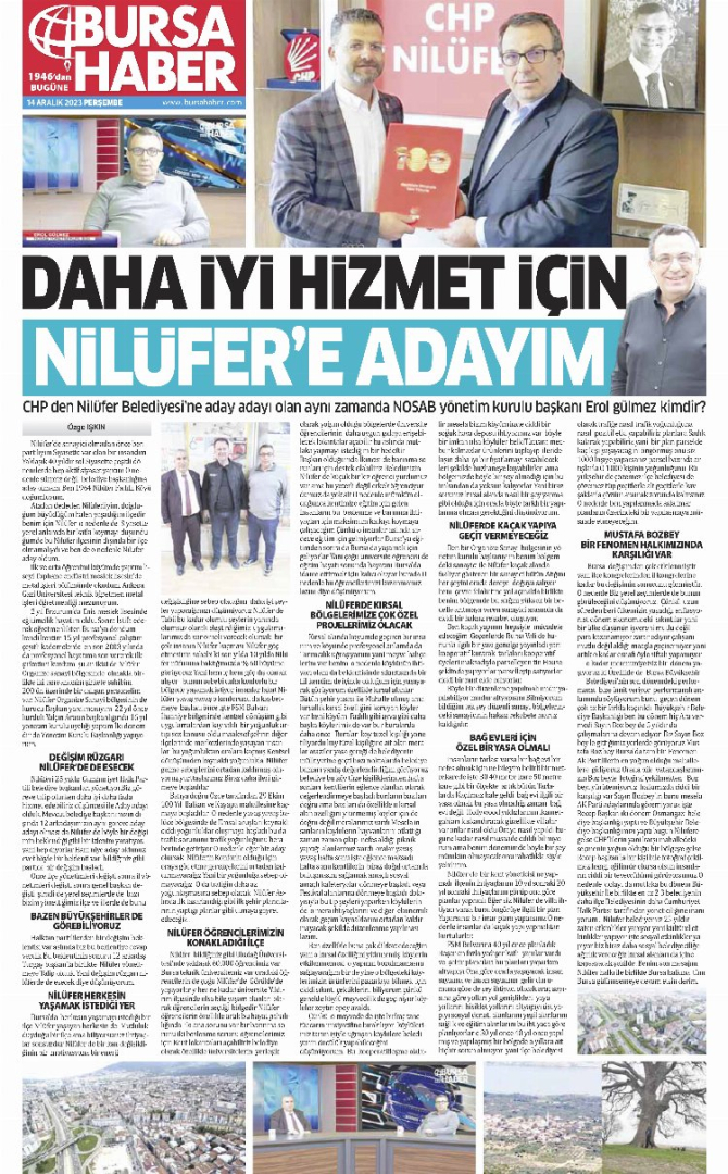 CHP’den Nilüfer Belediyesine aday adayı olan aynı zamanda NOSAB yönetim kurulu başkanı Erol Gülmez Bursa Haber'e önemli açıklamalarda bulundu.