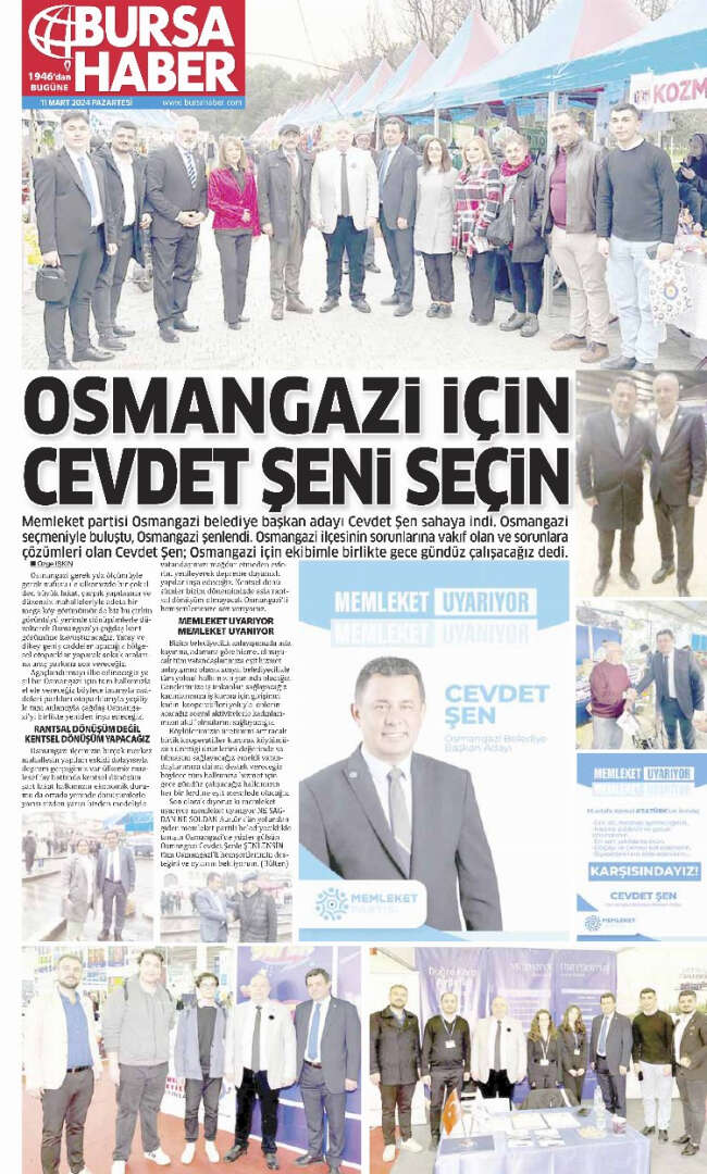 Memleket partisi Osmangazi belediye başkan adayı Cevdet Şen sahaya indi. Osmangazi seçmeniyle buluştu, Osmangazi şenlendi. Osmangazi ilçesinin sorunlarına vakıf olan ve sorunlara çözümleri olan Cevdet Şen; Osmangazi için ekibimle birlikte gece gündüz