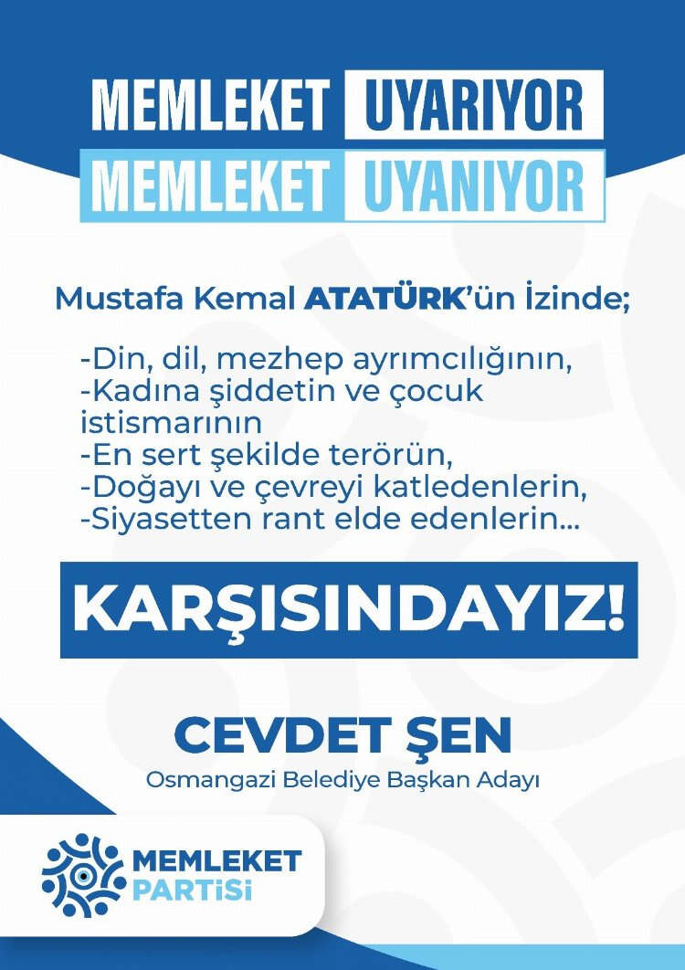 Son olarak diyoruz ki memleket uyarıyor memleket uyanıyor NE SAĞDAN NE SOLDAN Atatürk’ün yolundan giden memleket partili belediyeciklikle tanışın Osmangazi’de yüzler gülsün Osmangazi Cevdet Şenle ŞENLENSİN tüm Osmangazi’li hemşerilerimin desteğini ve oylarını bekliyorum.