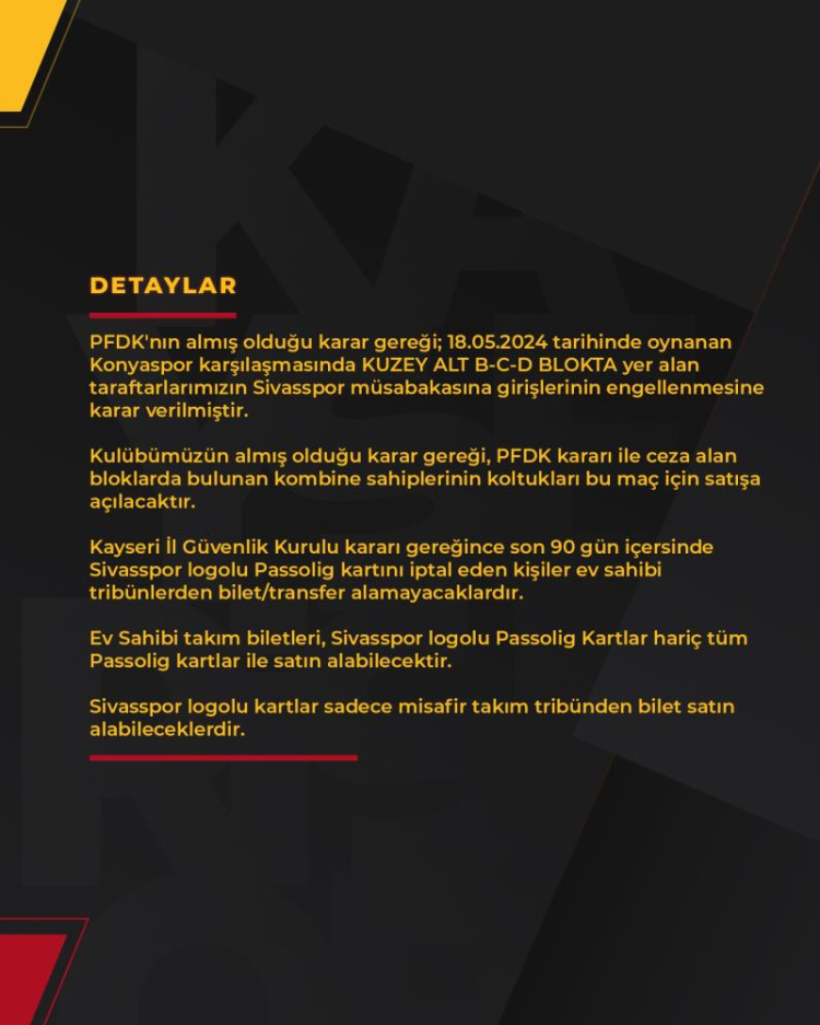Kayserispor-Sivasspor maçının biletleri satışa çıkıyor