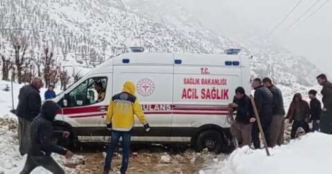 Yolda mahsur kalan ambulansı köylüler kurtardı