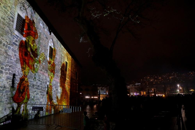 Bursa Büyükşehir Belediyesi, fethin 700. yılı etkinlikleri kapsamında Pirinç Han duvarlarını ve Tophane surlarını birer dev ekrana dönüştürerek Bursalılara görsel şölen yaşattı.