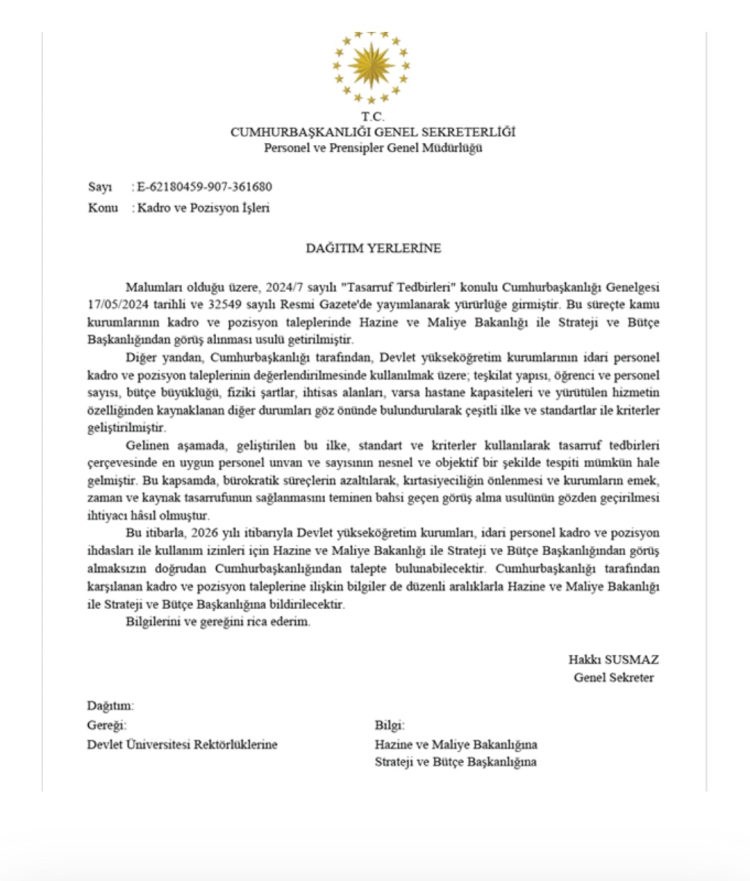 Devlet Üniversitelerindeki sıkıntının giderilmesi için Cumhurbaşkanlığınca yeni bir genelge yayınlandı. Genelgede “2024/7 sayılı Tasarruf Tedbirleri kapsamında devlet üniversiteleri tarafından yapılacak kadro ihdas ve izin işlemleri öncesi Hazine ve Maliye Bakanlığı ile Strateji ve Bütçe Başkanlığından izin alınması zorunluluğu getirilmişti. Cumhurbaşkanlığı tarafından yeniden yapılan değerlendirme sonucunda; söz konusu uygulamanın kaldırılarak doğrudan Makamlarından bu sürecin yürütülmesinin uygun olduğuna karar verilmiştir. 09/02/2026” açıklaması yapıldı.