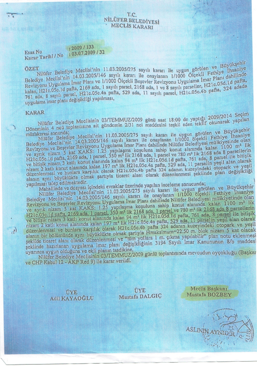 Bu kararlar 08.12.2011 tarihinde 2011/19 sayılı kararla Nilüfer Belediye Meclisinden geçmiş. Yine 3194 sayılı İmar Kanunu gereğince 19/04/2012 tarihinde de Büyükşehir Belediye meclisinden geçirilmiş. Kabul edilmiş.