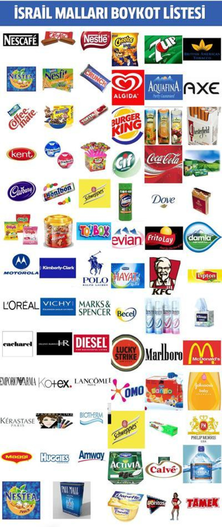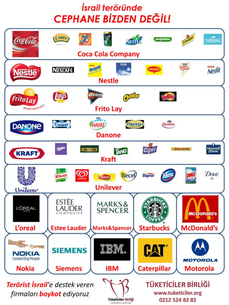 Boykot listesi hazırlanırken uluslararası kaynaklar araştırılarak İsrail sermayeli firmalar ile İsrail'e destek veren, ülkemizde faal olan ve boykotu mümkün olan firmalar dikkate alınmıştır. Buna göre;